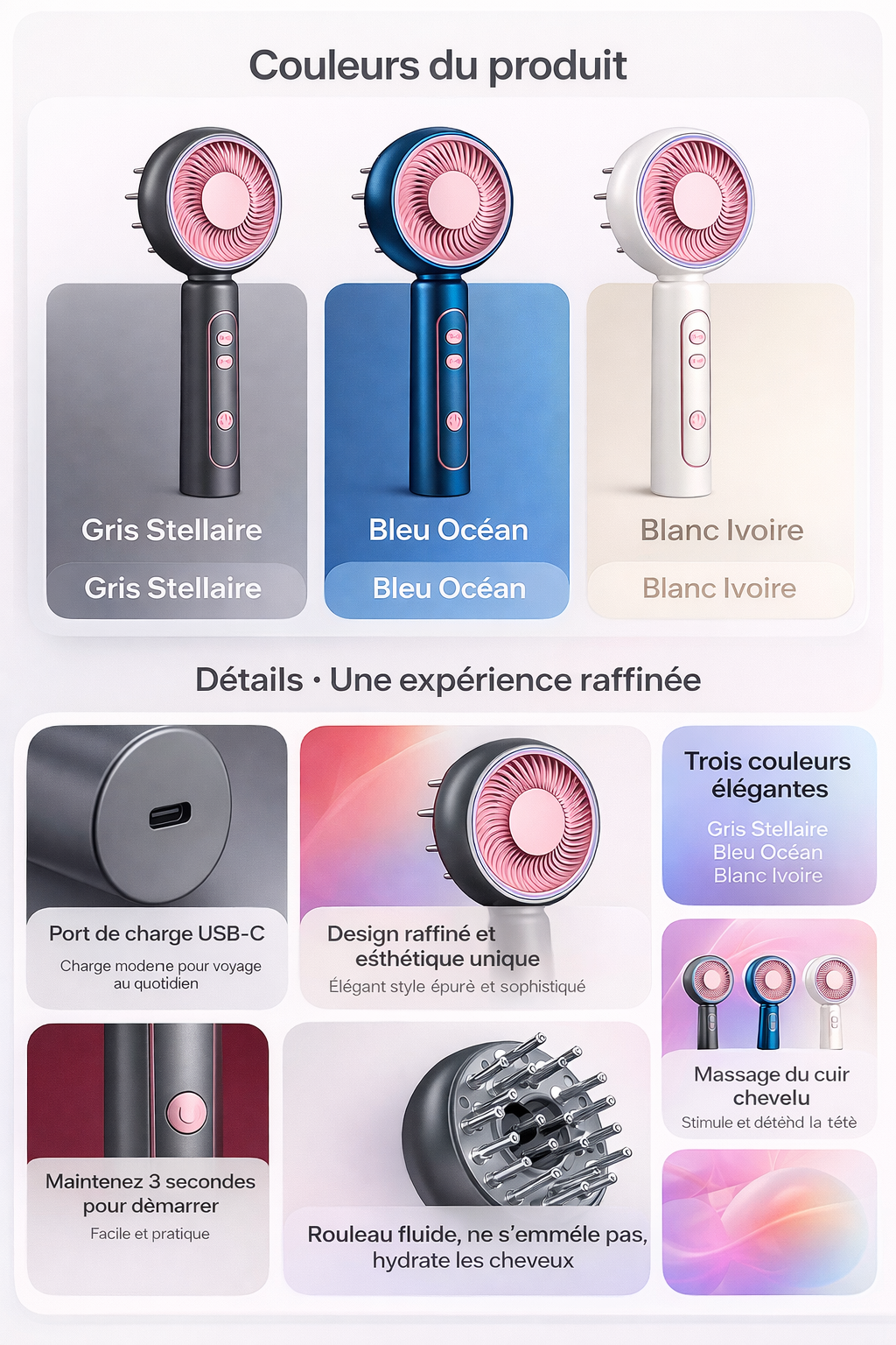 Activation du cuir chevelu. Vous ressentez une chaleur douce et une détente lors de chaque session de massage.